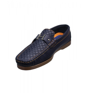 Este modelo se distingue por su capellada en tono azul profundo, un color sobrio y moderno que transmite carácter y versatilidad. El material sintético de alta calidad presenta un acabado semi mate que resalta la riqueza del color, manteniendo una apariencia limpia y refinada. La parte superior combina una textura tejida en patrón geométrico que aporta un toque artesanal y visualmente atractivo, logrando un balance perfecto entre lo clásico y lo contemporáneo.