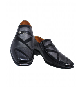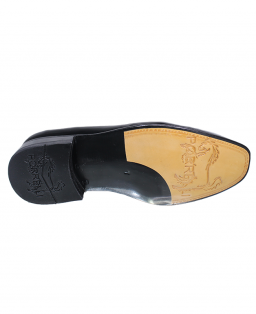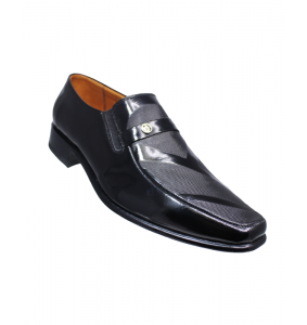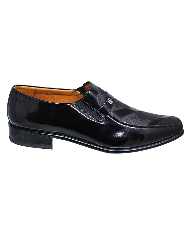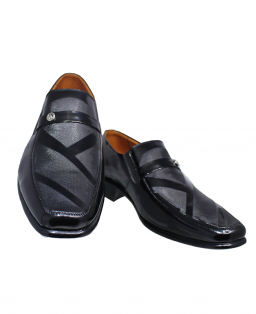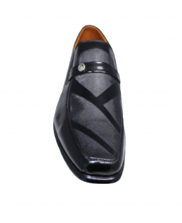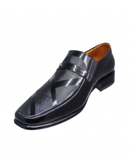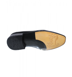 Además, este modelo cuenta con una versión elaborada en cuero riviera de alto brillo, ideal para ceremonias y eventos nocturnos. Esta versión incorpora un detalle decorativo en el empeine: una banda de cuero con botón metálico grabado que aporta distinción sin recargar el diseño.