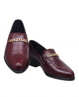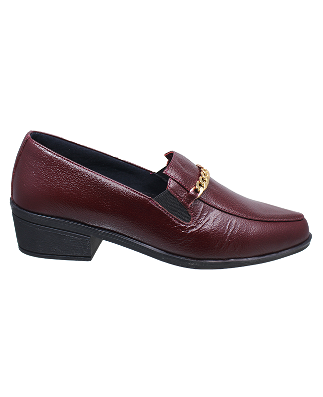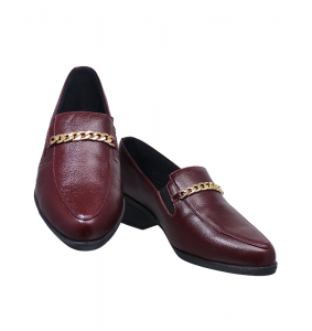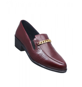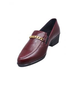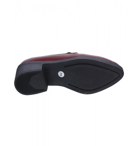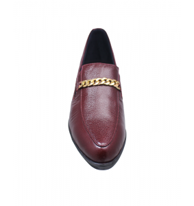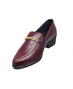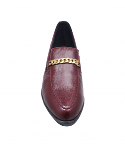 En el empeine se incorpora un detalle decorativo tipo cadena metálica en tono dorado, que aporta un contraste sutil y refinado frente al color cereza del cuero.
